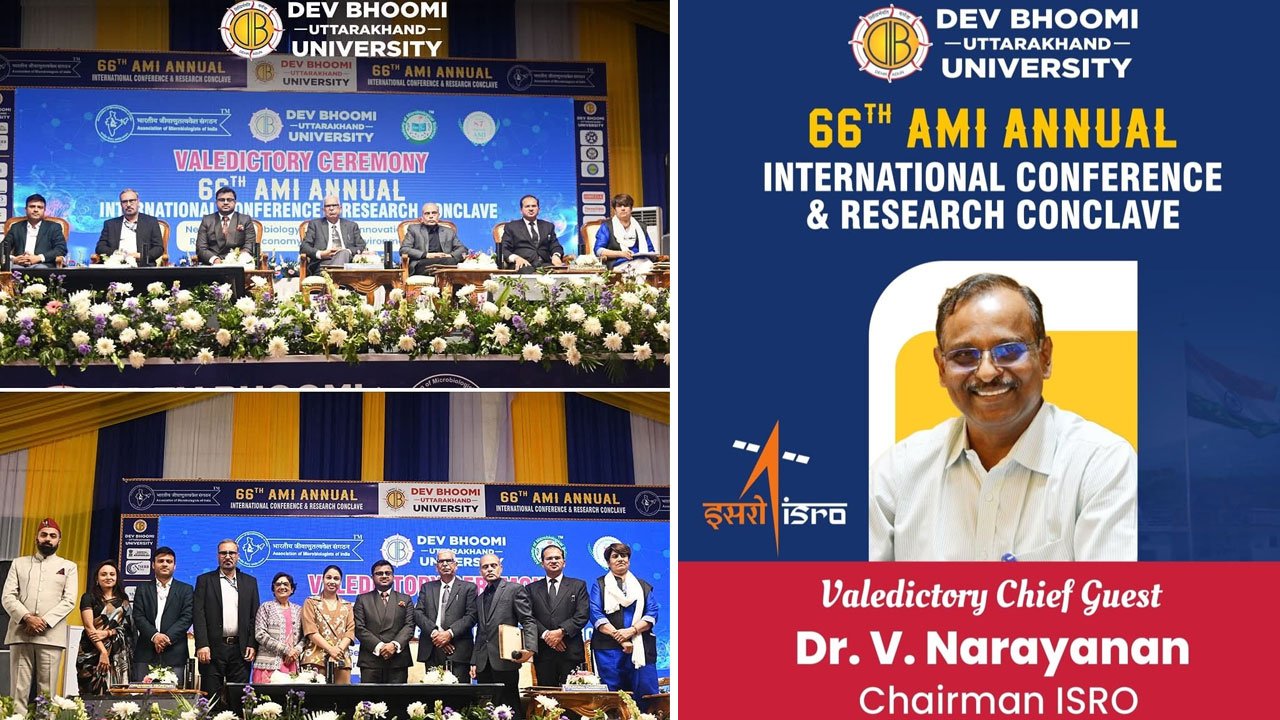 देहरादून। देव भूमि उत्तराखंड यूनिवर्सिटी (DBUU) में चल रही अंतरराष्ट्रीय कॉन्फ्रेंस के समापन समारोह में आज AMI की तरफ से 31 और DBUU की तरफ से 13 युवा शोधकर्ताओं को सम्मानित किया गया। DBUU के विशाल प्रांगण में आयोजित इस भव्य समारोह में इसरो के चेयरमैन प्रोफेसर वी. नारायण ने मुख्य अतिथि के रूप में ऑनलाइन शिरकत की।